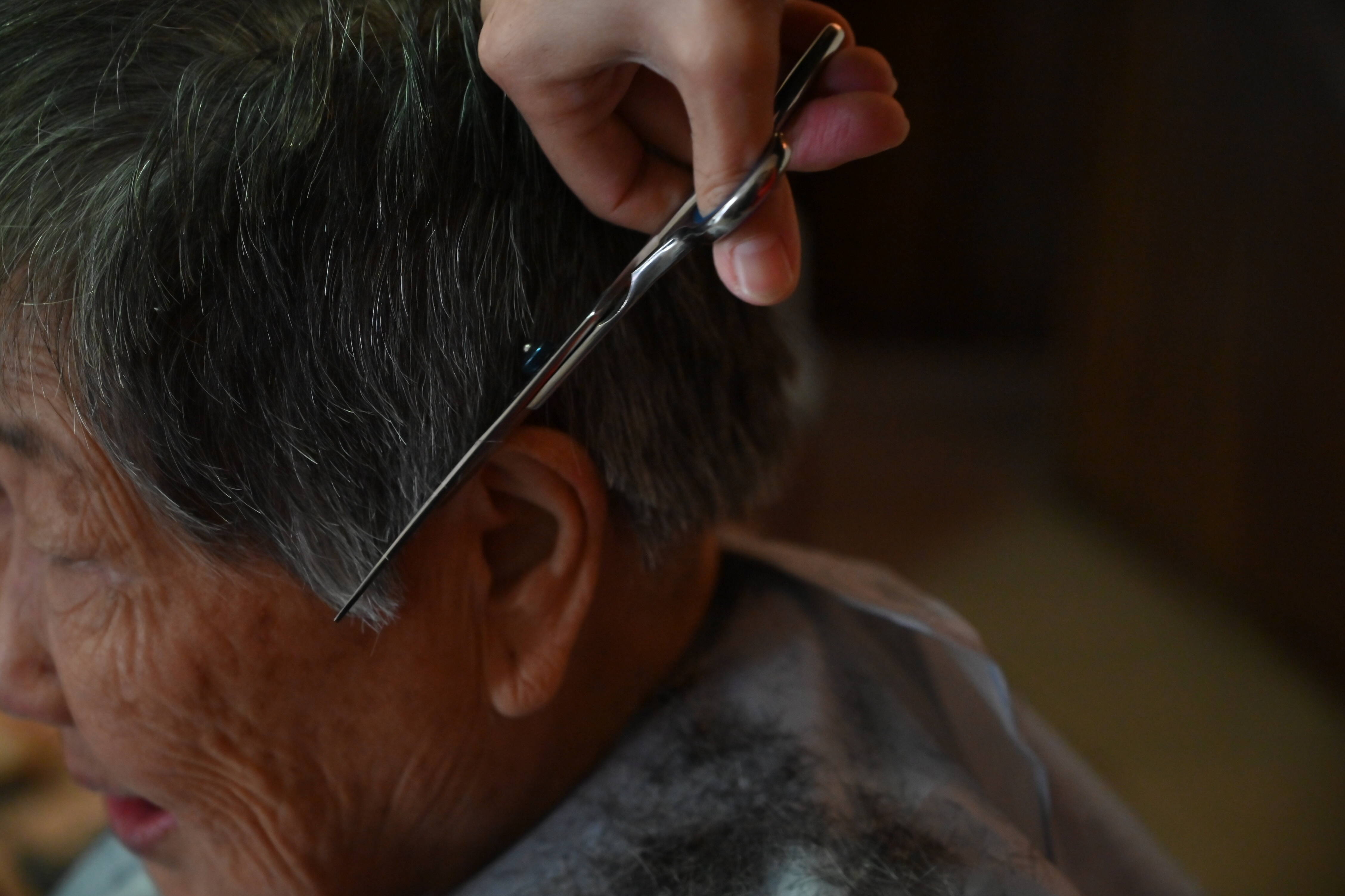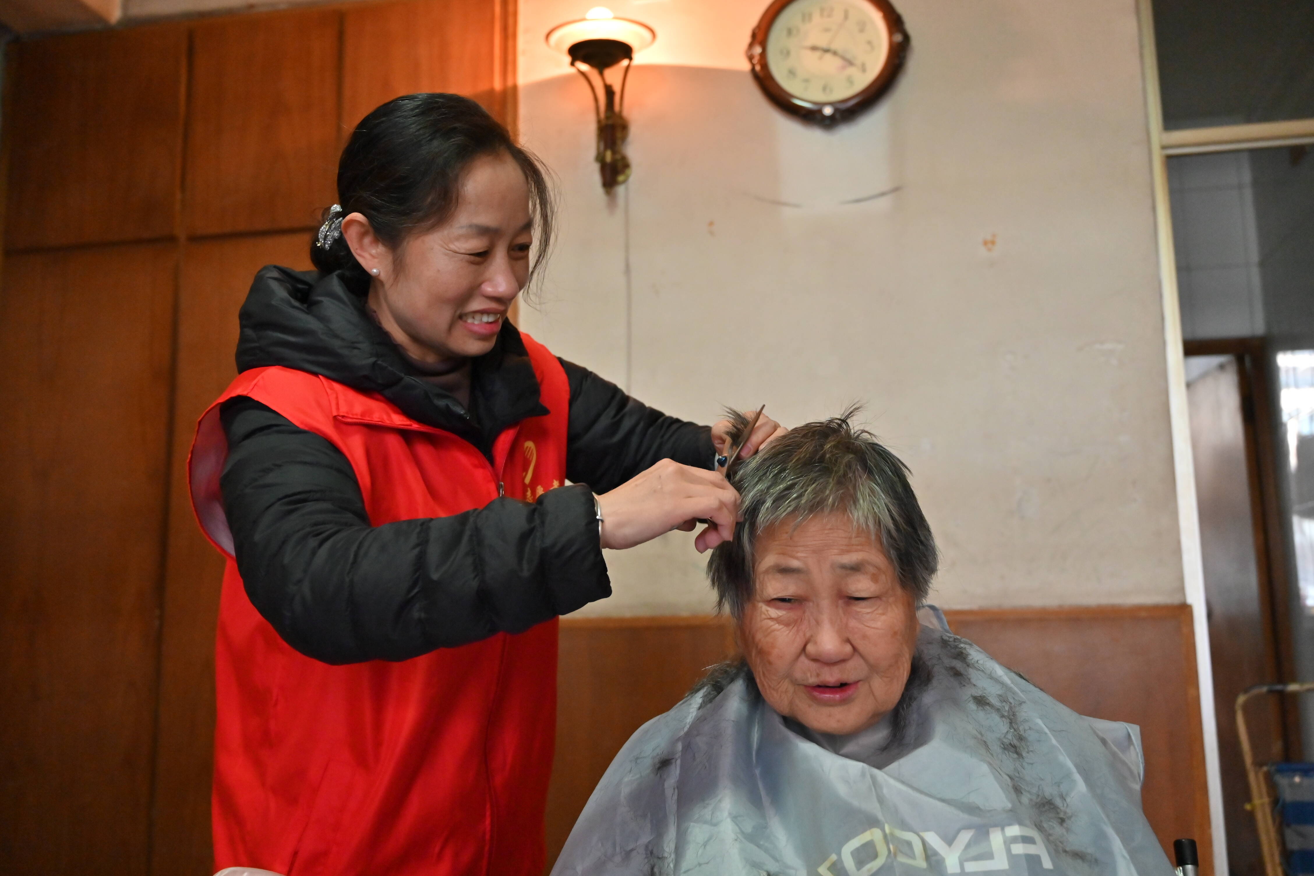 “阿姨,天气马上就要降温了,我帮您把头发理短一些,这样您就能少出门啦。要多注意天气变化,天凉了少出门,有事儿随时给我们打电话……”志愿者一边为陈大姨理发一边向其普及秋冬交替期间应该注意的养生进补及保健等相关知识。