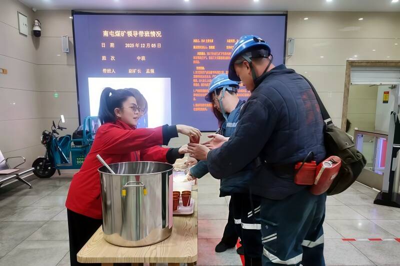 在该矿井口,志愿者们为来往上下井的一线职工贴心送上热气腾腾的姜茶,以及装有火腿肠、八宝粥、面包等物品的“暖心礼包”,并贴心提醒职工们注意保暖,勤洗手、常通风。